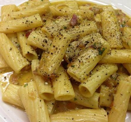 Without a doubt, this is a legend because after doing some extensive historical research in my cookbook room at Jasper’s this past week, I found that carbonara dates back to 1837 where a recipe was noted in the cookbook “La Cucina Teirico Pratica”.